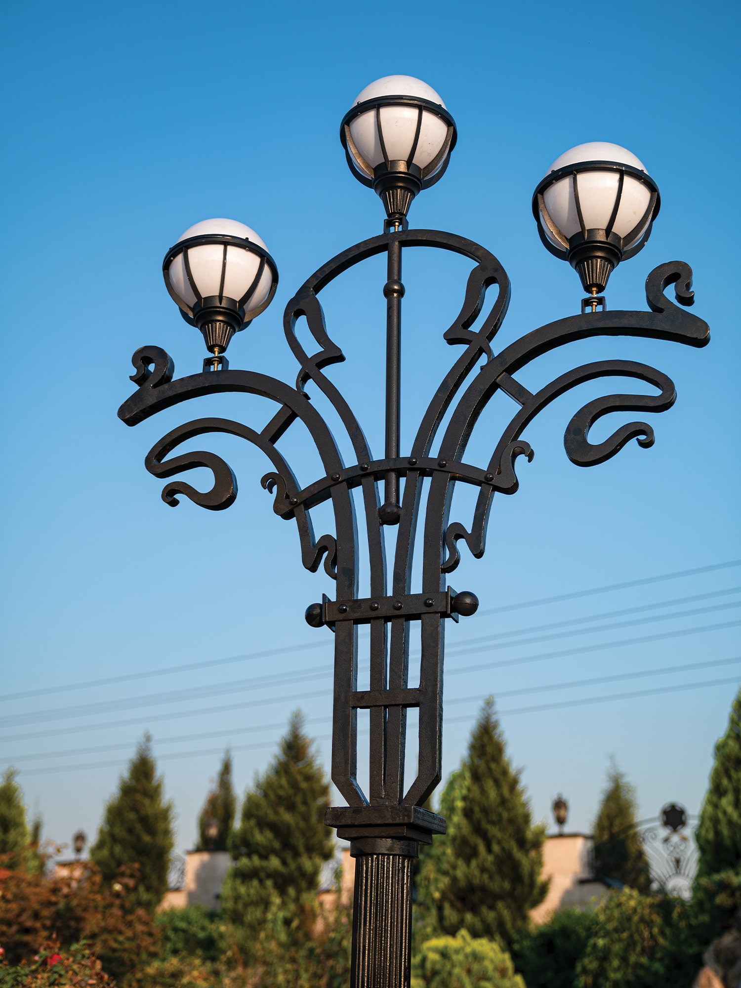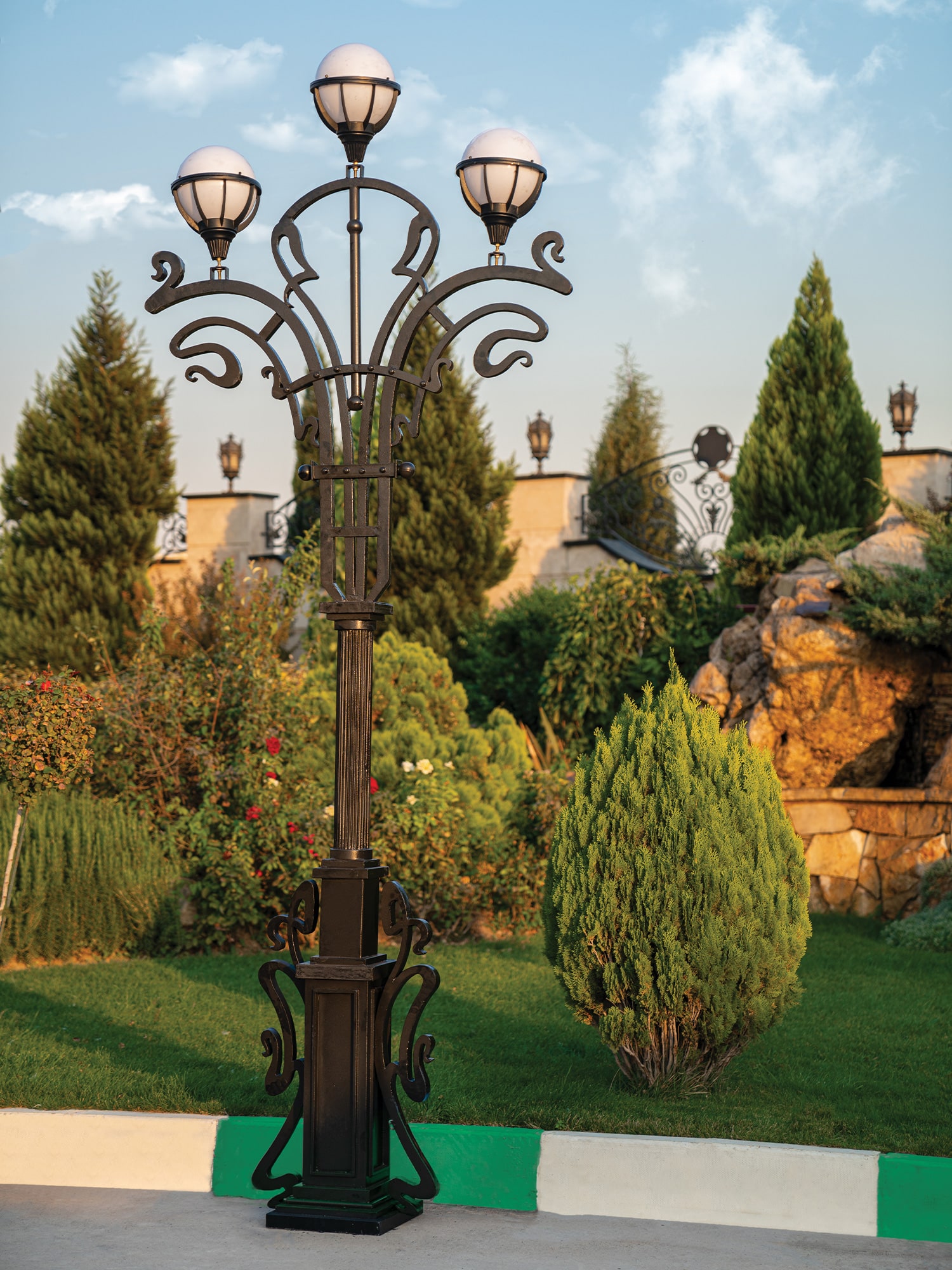 The Art Nouveau Lamp exists as a handcrafted work of art which draws inspiration from Art Nouveau principles. This lamp stands out in classical and neoclassical spaces because it consists entirely of wrought iron materials crafted through traditional blacksmithing methods. The curved framework and ornate decorations and spherical lighting fixtures create a lighting system that functions as a decorative architectural piece.