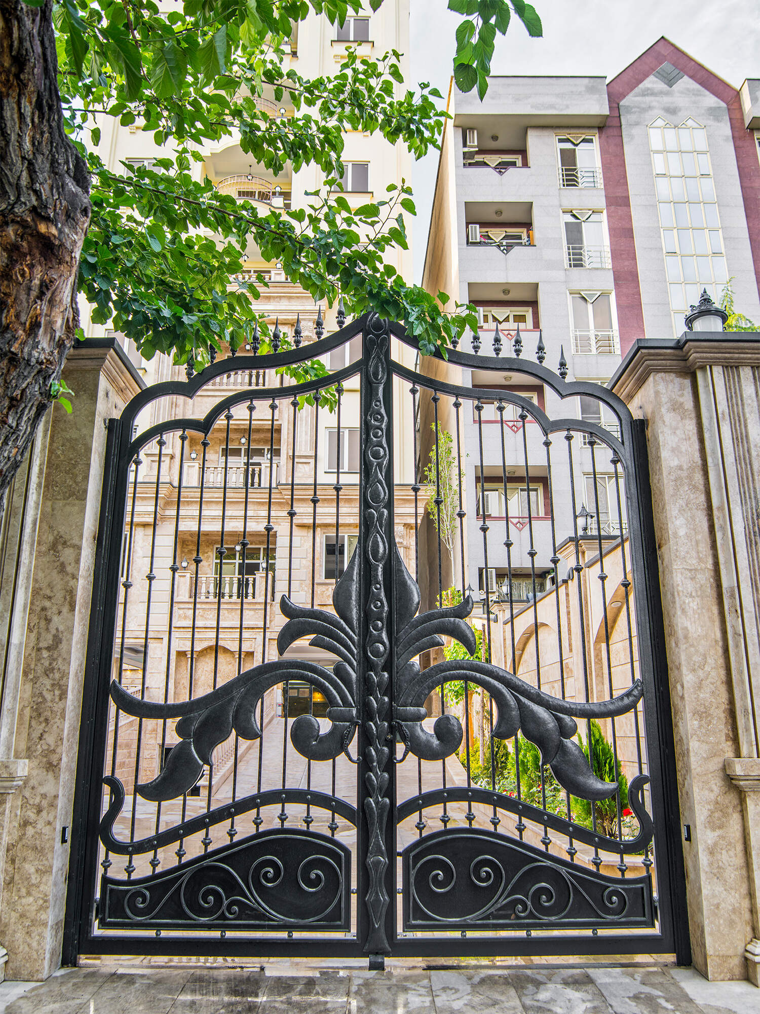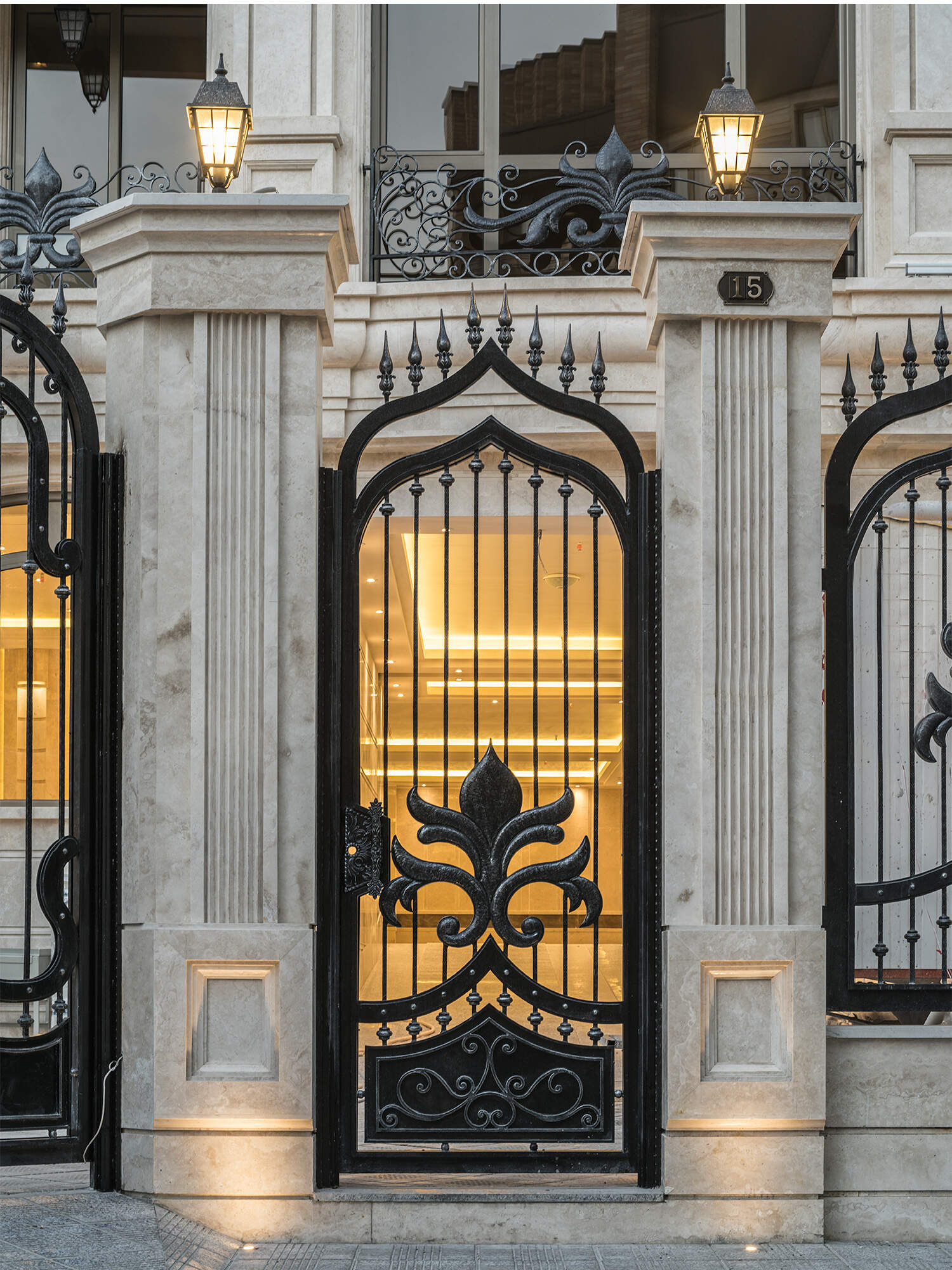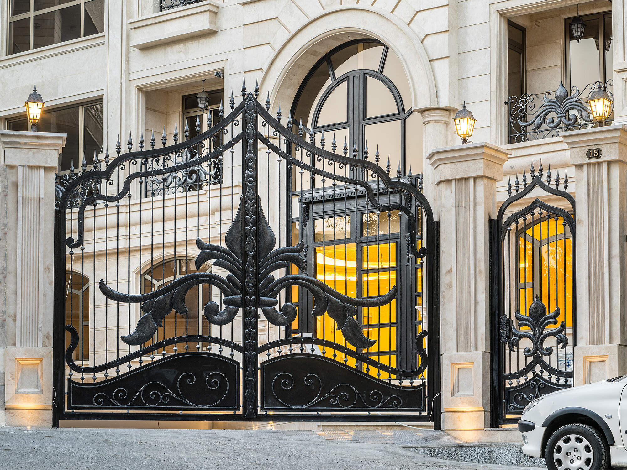 The Chenaran door serves as an entrance masterpiece that combines architectural elements with metal craftsmanship. The premium Samen Ferforge collection includes the Chenaran door which represents an entrance masterpiece that unites grandeur with symmetry and elegance. Luxury buildings gain an unparalleled touch when this door features its metallic structure combined with decorative wrought iron details and stone framing. The entrance combines floral motifs with stone columns and wall-mounted lights to create a sophisticated space that maintains authenticity.