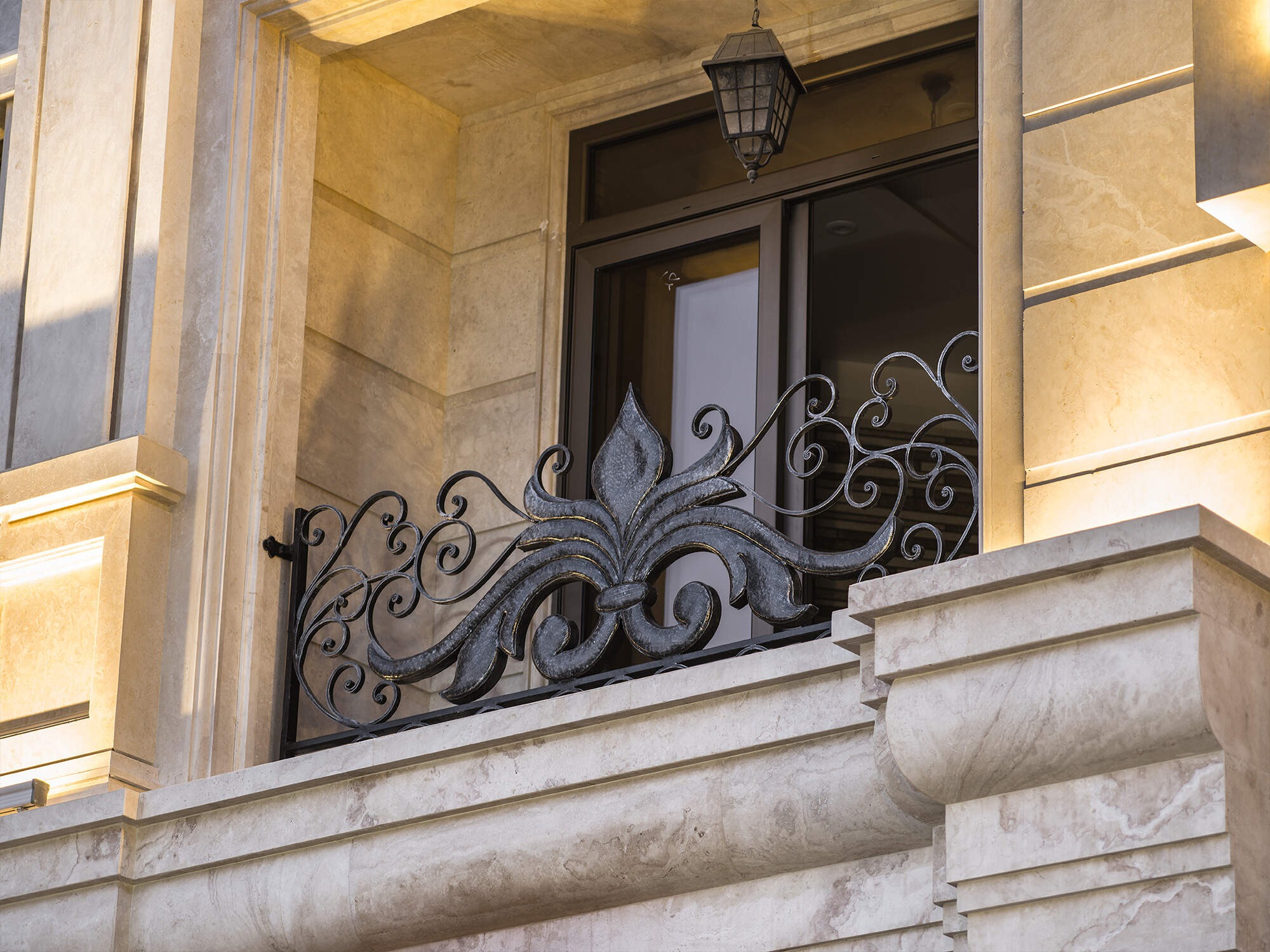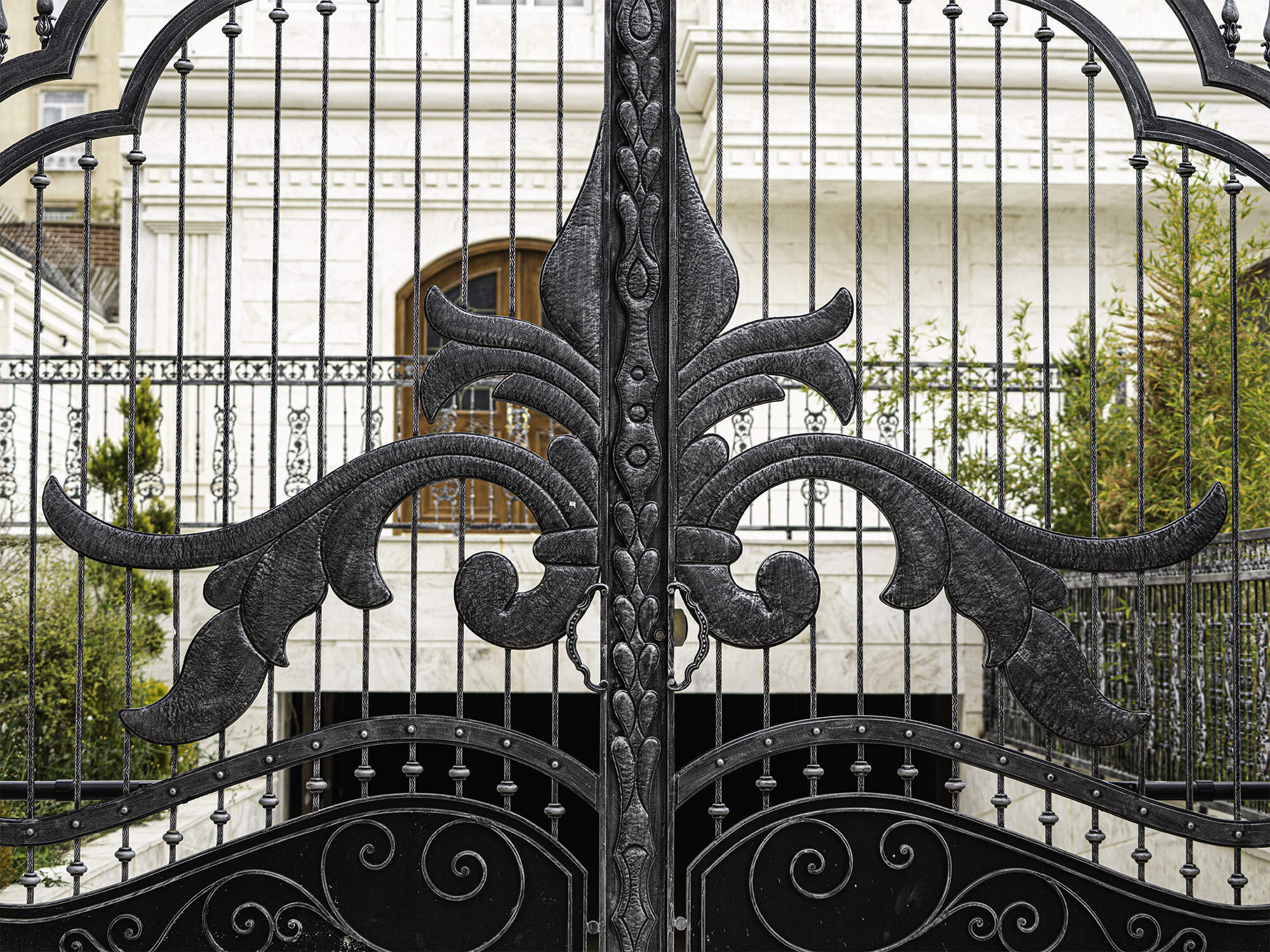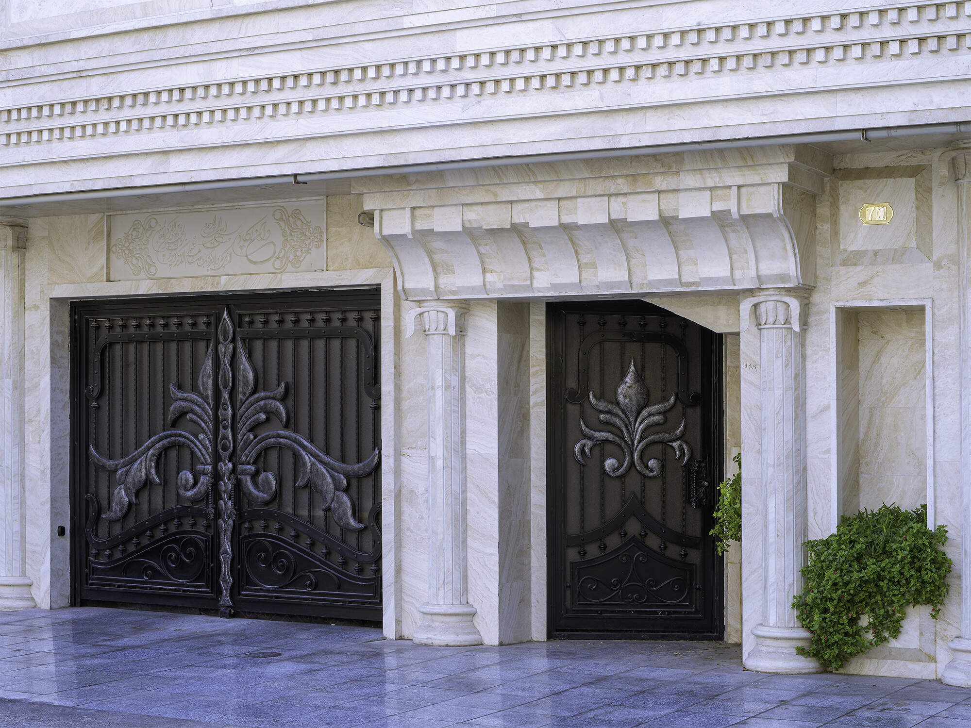 The Chenaran door serves as an entrance masterpiece that combines architectural elements with metal craftsmanship. The premium Samen Ferforge collection includes the Chenaran door which represents an entrance masterpiece that unites grandeur with symmetry and elegance. Luxury buildings gain an unparalleled touch when this door features its metallic structure combined with decorative wrought iron details and stone framing. The entrance combines floral motifs with stone columns and wall-mounted lights to create a sophisticated space that maintains authenticity.